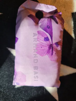 Práctica bolsa plegable con un bonito estampado de mariposas. - Diseño en tonos rosas y morados. - Marca Armand Basi.