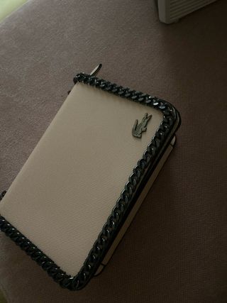 Elegante bolso de la marca Lacoste. - Color beige con detalles en negro. - Adorno de cadena metálica. - Logo de la marca visible.