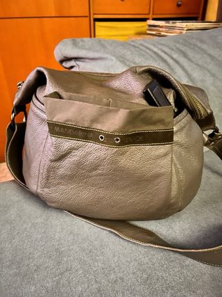Bolso grande (42x38 cm) de la marca Mandarina Duck en color caqui. Un accesorio espacioso y versátil. - Material: Piel de primera calidad. - Cierre principal con cremallera. - Bolsillo exterior frontal con solapa. - Varios bolsillos exteriores y interiores con y sin cremallera. - Correa ajustable para llevar al hombro. - esta en perfecto estado solo se le ha roto la cinta del bolsillo frontal.