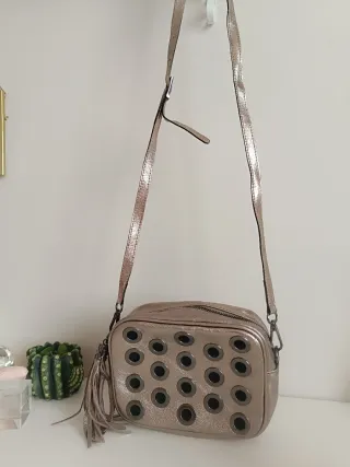 Bolso bandolera con un diseño llamativo y moderno. COMO NUEVO - Acabado metalizado en tono Bronce. - Detalle de tachuelas circulares. - Adorno de flecos. - Correa ajustable. MARCA ITALIANA ANDREA CARDONE CARDONE. MÁS COSITAS EN MI PERFIL