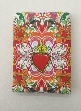 Funda para libro o tablet con un vibrante diseño de Frida Kahlo. - Cierre con botón de madera. - Estampado floral y ornamental. - Etiqueta de la marca Meraki. 18,5x25,5cm