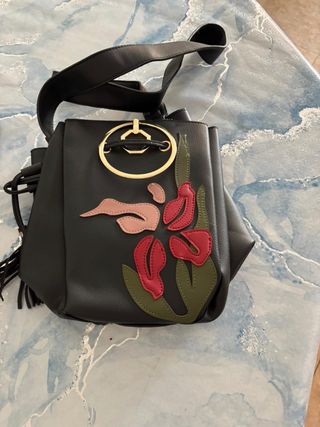 Bolso negro con un diseño floral llamativo. - Detalle de flores en tonos rosa, rojo y verde. - Asa superior y correa ajustable. - Adorno metálico dorado en la parte frontal. - Cierre de cordón y borlas.