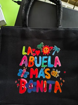 Bolsa de tela negra con un diseño colorido y divertido para regalar a la abuela. Dos bolsas. Una más pequeña y otra más grande. Para ver tamaño he puesto de referencia una libreta. - Mensaje La abuela más bonita pintado a mano. - Decorada con dibujos de sol, palmeras, mariposas y abejas. -