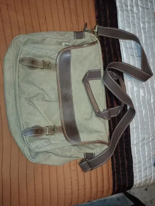 Bolso de hombro de la marca Coronel Tapioca. - Material de lona resistente. - Detalles en piel. - Cierre con hebillas metálicas.