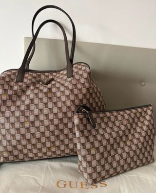 Conjunto de bolso shopper y bolso de menor tamaño a juego de la marca Guess. - Bolso shopper con estampado geométrico. - Bolso pequeño a juego con cierre de cremallera. - Diseño en tonos beige y marrón.