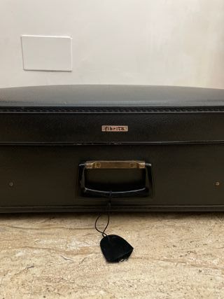 Conjunto de tres maletas vintage de la marca Fibrita. - Color negro. - Rígidas, con diseño clásico y elegante. - Revestidas en el interior con papel amarillento por el paso del tiempo que se puede quitar y decorar al gusto personal
