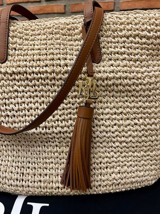 Bolso RALPH LAUREN tote de rafia con detalles en piel. - Material principal: rafia. - Asas y detalles: piel marrón. - Adorno de borla. - Logo de la marca en la borla. Tiene una mancha en el forro interior (ver foto). Bolsa de tela con logo de ls marca