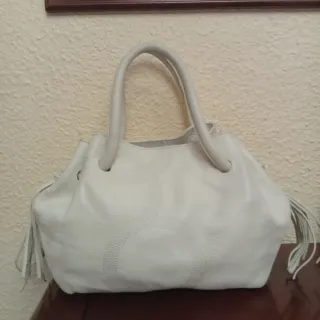 Bolso de piel en color blanco roto de la marca Purificación García. Presenta un diseño moderno , en perfecto estado, asas base y esquinas en perfecto estado interior forrado con la marca con bolsillo con cremallera grabada con la marca en perfecto estado, lleva tiras a los lados de piel , blancas solas o se puede combinar con tiras que lleva marrones y Camel para combinar con calzado marrón o Camel .mide 34 ancho 24 alto 15 fondo - Material: Piel - Color: Blanco roto - Adornos de flecos laterales piel