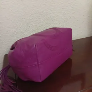 Bolso de piel con las iniciales PG grabadas. Color fucsia buganvilla, en perfecto estado, piel suave y muy cuidada, interior forrado con 3 departementos grandes el central con broche iman , es muy amplio .. forrado con bolsillo con cremallera grabada con la marca. Es bonito . Mide 38 x 28x 21 - Color fucsia buganvilla - Piel texturizada. - Costuras blancas de contraste. - Asas de mano cómodas. - Detalle metálico en las uniones de las asas.