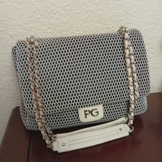 Bolso de mano con un diseño acolchado y detalles en piel.es acolchado con asas , base, laterales,esquinas y la marga PG en piel marrón .en perfecto estado, interior forrado con la marca PG .con bolsillo con cremallera grabada con la marca - Acolchado en el cuerpo principal. - Asas superiores de piel. - Detalle de logo en la parte frontal de piel