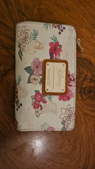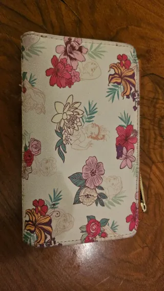 Cartera con un bonito estampado floral de princesas Disney de la marca Loungefly - Diseño floral con varias princesas. - Cierre de cremallera. - Detalle de placa metálica con logo. Tiene marcas de uso, la parte del broche un poco rota como sale en las fotos.