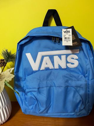 Mochila Vans de color azul con el logo de la marca en blanco. - Compartimento principal espacioso. - Bolsillo frontal con cremallera. - Correas ajustables para los hombros. -Capacidad 22 litros. - Medidas 42.5x32.4x12.1 cm -Bolsillo interior para portatil y exterior para botella.