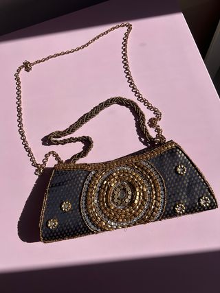 Elegante bolso de mano artesanal con un diseño intrincado. - Adornado con cuentas y lentejuelas doradas. - Detalles de pedrería en la parte frontal. - Cadena dorada para llevar al hombro o cruzado.