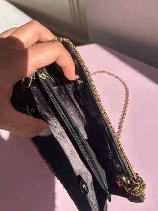 Bolso de mano o bandolera de la marca Fortime. Presenta un diseño elegante con detalles de pedrería y lentejuelas. - Color principal negro con adornos dorados. - Cierre de solapa. - Correa ajustable para llevar al hombro o cruzado.