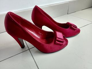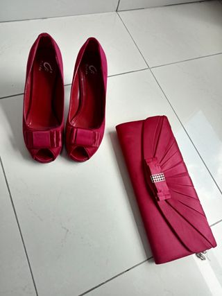 Zapatos color burdeos con lazo y dedo descubierto. El tacón mide 9cm y tiene una pequeña plataforma oculta de 1,5 cm. Son de marca Feilida Bolso color burdeos con lazo y piedrecitas del mismo color, cadena plateada que se puede poner y quitar. Es de marca Iber bolsos.
