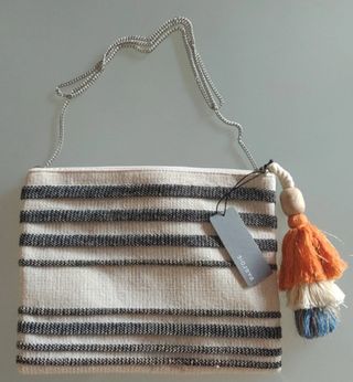 Bolso de la marca Parfois con un diseño tejido y detalles brillantes. - Cierre metálico. - Cadena metálica. - Tejido tweed con hilos de colores.