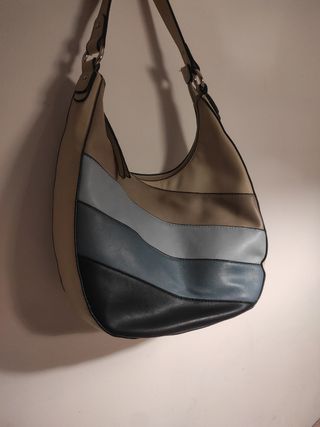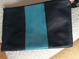Preciosa cartera de mano de la marca Parfois. Es de color azul marino y teal, con un diseño elegante y moderno. - Asa de hombro extraíble. - Cierre de cremallera. - Material: piel sintética.