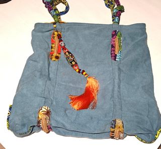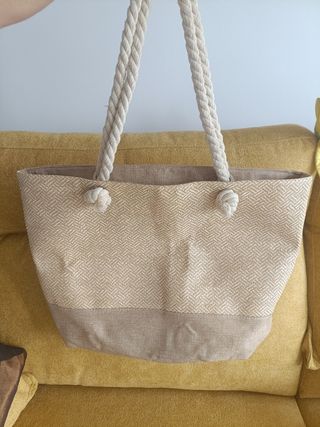 Bolso de loneta marca Natura con abalorios. Buen estado, aunque el colgante tiene algún desconchón. Mide 40 x 40 cm (sin contar las asas)