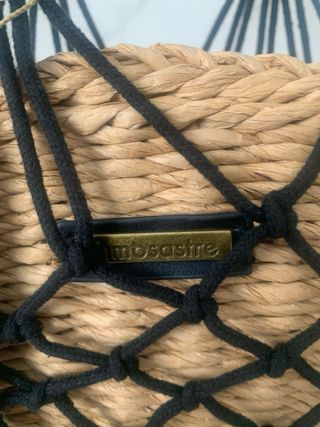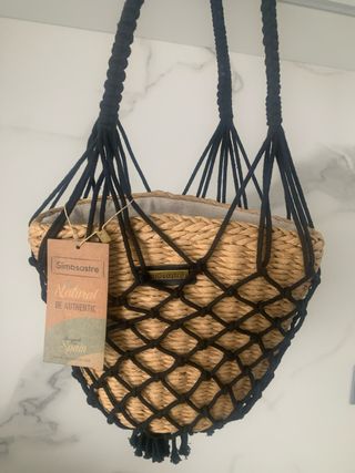 Precioso bolso de la marca Simosastre. Perfectamente nuevo con sus etiquetas - Material de rafia beige. - Asa de cuerda negra trenzada. - Diseño de red. - Incluye un pequeño bolsillo interior. Dimensiones : 21 x 23 x 9 cm
