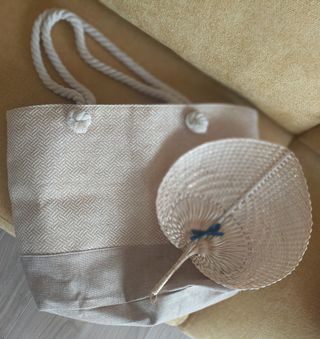 Precioso bolso de playa de color beige y marrón. Ideal para tus días de verano. Mide 50 cm de ancho, 37 cm de alto y 14 cm de fondo - Asa de cuerda resistente y cierre con cremallera. - Diseño elegante y sencillo. - Perfecto para llevar a la playa o piscina. - Incluye un abanico de rafia a juego.
