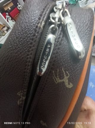 Bolso de la marca Petusco con un diseño elegante y práctico. Precio negociable. - Color principal marrón con detalles en naranja. - Cremallera plateada con tiradores grabados. - Estampado de figuras de animales.
