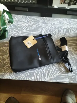 Bolso bandolera de la marca Jo&Mr.Joe. - Color negro. - Cierre de cremallera. - Detalle de texto ESSENTIAL GOODS en azul. Precio no negociable, venta por Walapop.