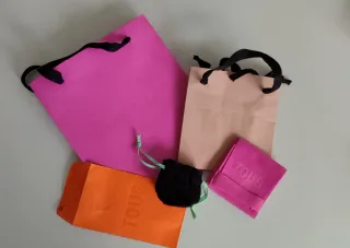Conjunto de bolsas y sobres de la marca TOUS. TODO 6€ - Bolsa grande en color rosa fucsia. - Bolsa mediana en color rosa palo. - Sobre en color naranja, usado, se ve en la foto. - Funda pequeña en color rosa fucsia. - Bolsa pequeña de tela negra con cordón.
