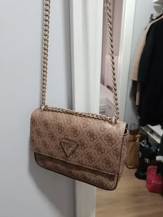 Elegante bolso de la marca Guess con un diseño clásico. - Acabado en tono marrón con detalles dorados. - Cadena dorada para llevar al hombro o cruzado.