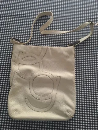 Bolso bandolera de piel en color beige con el logo de la marca grabado. - Diseño moderno y elegante. - Correa ajustable para mayor comodidad. - Cierre seguro.