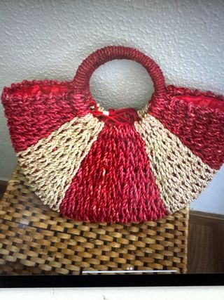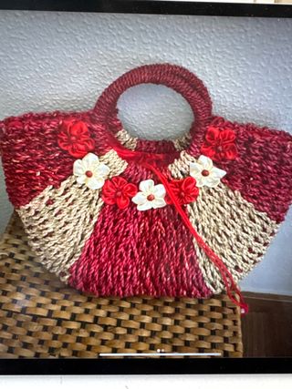 Bolso de rafia tejido a mano, con un diseño bicolor y adornos florales. - Tejido de rafia. - Adornos de flores rojas y blancas. - Asa de rafia. - Cierre de cordón.