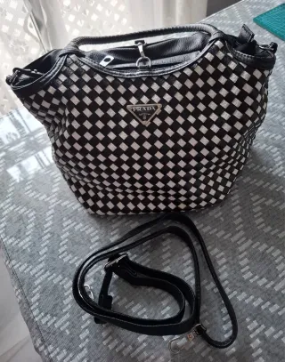 Bolso de hombro con un diseño tejido en blanco y negro. Incluye una correa ajustable. - Diseño tejido a cuadros, inspirado en marca de lujo - Correa de hombro desmontable. - Forrado totalmente - Nuevo sin etiqueta