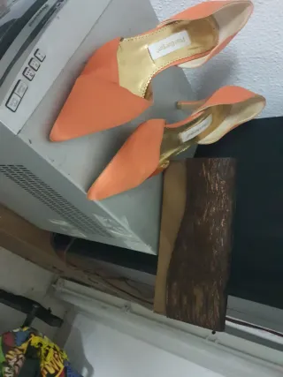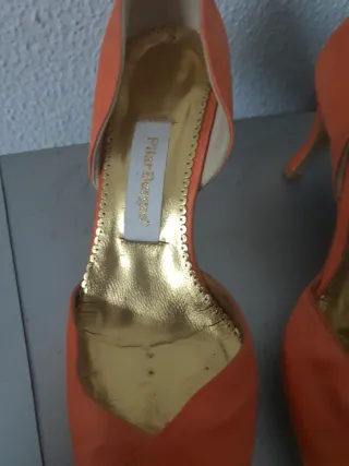 Elegante conjunto de bolso y zapatos de la marca Pilar Burgos. - Zapatos de tacón en color naranja. - Bolso a juego con detalles en marrón.