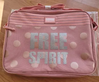 Mochila escolar con un diseño juvenil y moderno, perfecta para el día a día. - Estampado de lunares en tonos pastel. - Mensaje Free Spirit con acabado brillante. - Detalle de rayas en la parte superior. - Etiqueta de la marca MOVM. - Correa ajustable para llevar al hombro.