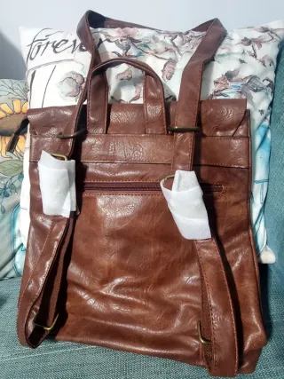 Bolso de estilo moderno con acabado en cuero sintético. - Color marrón. - Cierre de cremallera. - Correas ajustables para llevar como mochila. - Mide 30 de ancho,34 de alto y 8 de fondo.