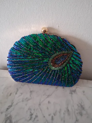 Elegante bolso de mano con un diseño inspirado en la cola de un pavo real. Perfecto para complementar tu atuendo en ocasiones especiales. - Cubierto de lentejuelas brillantes. - Cierre de botón dorado. - Diseño detallado con cuentas. Con cadena dorada para poder llevarlo en el hombro