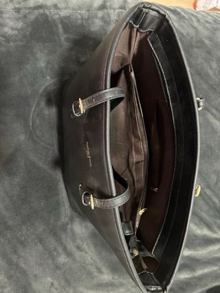 Bolso grande de color negro con un diseño elegante. - Cierre con hebillas doradas. - Detalle de marca en dorado.