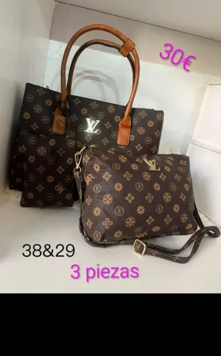 Conjunto de tres bolsos con el distintivo estampado de la marca. - Bolso grande con asas. - Bolso mediano con correa. - Pequeño neceser. - Color marrón.