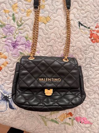 Elegante bolso de la marca Valentino en color negro con detalles dorados. - Diseño acolchado. - Cadena dorada. - Cierre metálico dorado. Lo pongo mas barato por las asas, estan un poco deterioradas
