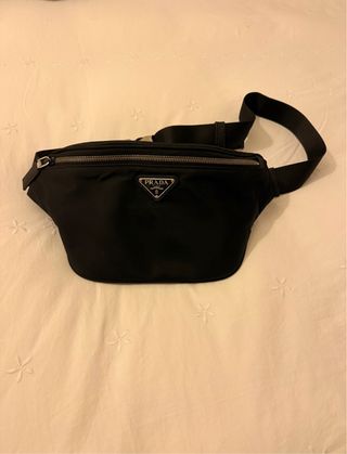 Riñonera Prada de la línea Re-Nylon en color negro, un modelo icónico y atemporal. La pieza se encuentra en muy buen estado, tal como se aprecia en las fotos, sin marcas de uso ni desgaste en el tejido. Detalles del artículo: • Autenticidad: Incluye fotos de todos los elementos de seguridad: logotipo triangular esmaltado, placa interior "Prada Made in Italy" y etiqueta blanca de fábrica con el número 255 en el bolsillo interior. • Material: Confeccionada en nailon de alta resistencia con detalles en piel Saffiano. • Estado: Cremalleras y herrajes en perfecto funcionamiento. • Uso: Correa ajustable para llevar a la cintura o cruzada