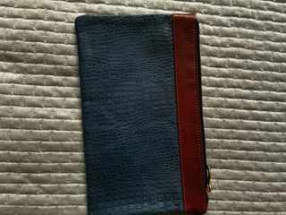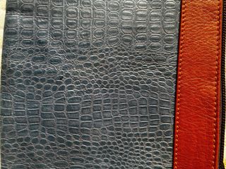 Elegante bolsito de mano de la marca Unrique. - Confeccionado en piel. - Diseño texturizado tipo piel de cocodrilo. - Combinación de colores azul y marrón. - Medidas en fotos