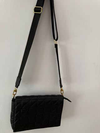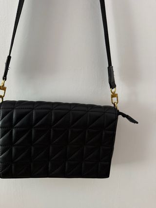 Bolso negro con un diseño acolchado y moderno. Cuenta con una correa ajustable para llevarlo cómodamente. - Diseño acolchado con patrón geométrico. - Correa de hombro ajustable. - Herrajes dorados.