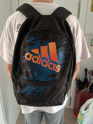 Mochila negra de la marca Adidas con un diseño llamativo. Esta en muy buen estado, con poco uso.