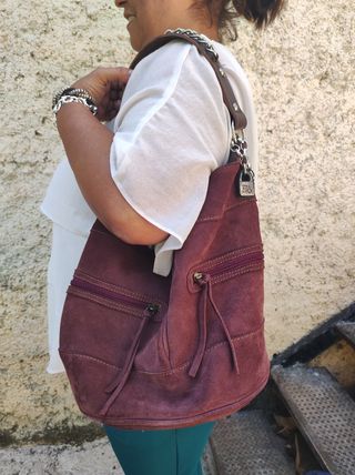 Chulísimo bolso de la marca española Uno de 50 estilo bombonera grande aunque se cierra con clics no con cordón, de ante en color burdeos oscuro. Perfecto estado exterior e interior. Envío a cargo del comprador. No se admiten devoluciones.