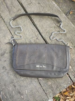 Versátil bolso de la marca española Uno de 50, de cuero marrón oscuro con la solapa troquelada que puedes usarlo tanto al hombro o tipo bandolera con la cadena puesta, como bolso de mano si se la quitas! Envío a cargo del comprador. No se admiten devoluciones.