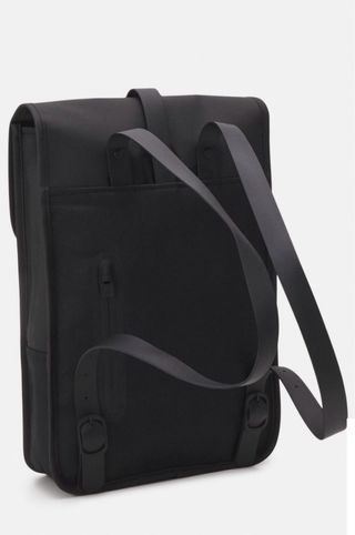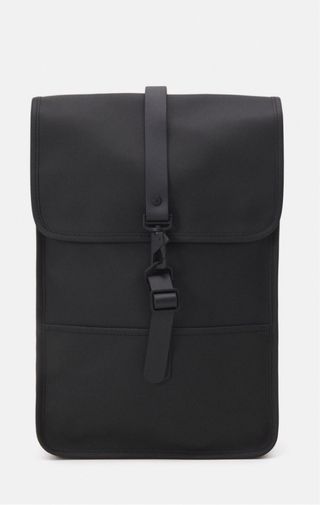 Mochila de la marca Rains en color negro. Diseño moderno y funcional. - Cierre con correa y hebilla. - Bolsillo frontal con cremallera oculta. - Correas ajustables para los hombros.