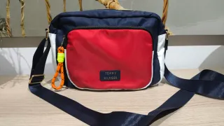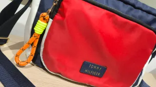 Bolso de la marca Tommy Hilfiger con un diseño moderno y llamativo. - Combinación de colores azul y rojo. - Detalle de cuerda naranja con accesorio fluorescente. - Etiqueta de la marca en contraste.