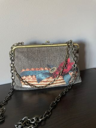 Bolso con un diseño vibrante y llamativo, perfecto para añadir un toque de color a tu estilo. - Estampado patchwork con motivos florales y geométricos. - Detalle de bordado de flores en la parte frontal. - Adornos de tachuelas metálicas. - Cierre de cremallera. - Correa ajustable para llevar al hombro o cruzado. La correa tiene una pequeña marca desgastada