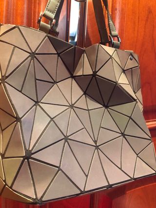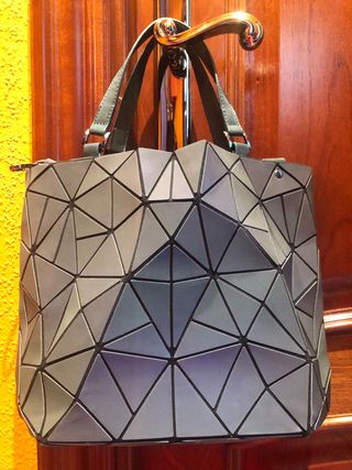 Bolso geometrico que cambia de color cuando le da la luz. Viene con correa larga sin usar.