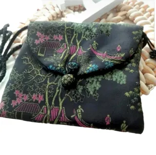 Mini bolso bandolera de tela, con finos bordados (inspiración China). Borla lateral. Bolsito interior. Largo 14'5 cm., alto 13.