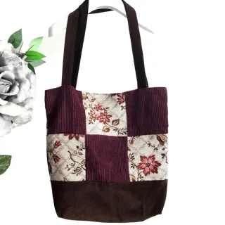 Bolsa patchwork en tonos burdeos, marrón, caqui y crema. Bordados en tela combinando con 2 tipos de pana. Medidas sin asas 35 cm. de largo, 37 de alto. Largo asas 32 cm. aproximado. (Se puede llevar al hombro). Con forro. En muy buen estado.